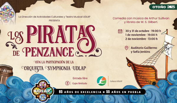 Del 30 de octubre al 2 de noviembre, la UDLAP presentará su nuevo musical: Los Piratas de Penzance, una divertida y colorida producción de teatro musical que, con alrededor de 40 artistas en escena y más de 90 personas involucradas en su realización, promete conquistar al público poblano con su energía, humor y gran despliegue escénico.