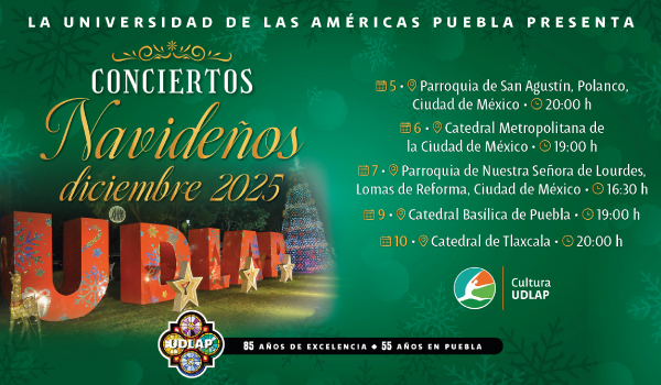 Este año, la temporada de Conciertos Navideños UDLAP 2025 llegará a distintas sedes emblemáticas del país en una gira que compartirá el talento artístico de la UDLAP. Hoy viernes 5 de diciembre el recorrido inicia en la Parroquia de San Agustín en Polanco, Ciudad de México a las 20:00 horas donde los Equipos Representativos de la UDLAP unirán a las filas de su coro a talentosos estudiantes del Instituto Cultural Copán, el Colegio México Bachillerato, IT Innovation School Campus Puerto Vallarta y el Instituto Técnico y Cultural. Este mismo ejercicio se repetirá en la Catedral Metropolitana de la Ciudad de México a las 19:00 horas.