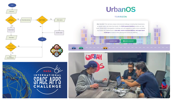 El equipo de la Universidad de las Américas Puebla compitió en la categoría Data Pathways to Healthy Cities and Human Settlements, teniendo como objetivo demostrar cómo los planificadores urbanos pueden utilizar datos de observación de la NASA y datos del INEGI para diseñar estrategias inteligentes de crecimiento urbano en favor del bienestar de las personas y del medio ambiente de Torreón, Coahuila. Bajo esta premisa los estudiantes de la UDLAP crearon UrbanOS, una plataforma web enfocada en dicha ciudad.