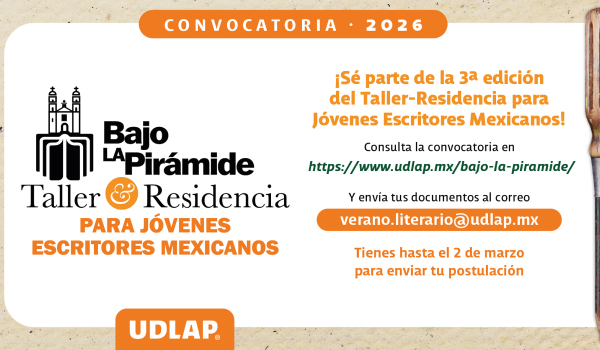 Gracias al éxito obtenido en ediciones pasadas, la UDLAP, a través del Departamento de Letras y Humanidades, convoca a jóvenes escritores mexicanos a postularse a la tercera edición del Taller-Residencia Bajo la Pirámide, actividad que se realizará del 8 al 19 de junio de 2026, con el objetivo de fomentar la literatura, su ejercicio riguroso, sus búsquedas y su mayor circulación.