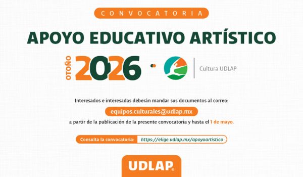 La Universidad de las Américas Puebla abre su convocatoria de Apoyo Educativo Artístico, una excelente oportunidad para estudiantes de preparatoria o bachillerato con talento y compromiso en el ámbito artístico que deseen iniciar su licenciatura en el periodo de Otoño 2026, formar parte de los Equipos Representativos Culturales de la UDLAP, impulsar su talento, y desarrollarse en un entorno de formación profesional de alto nivel como el que ofrece esta institución educativa.
